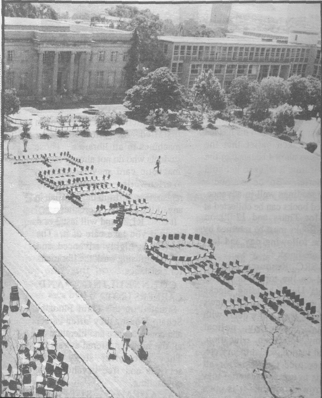 It took some time to organize the assembly for the march, so my students and I, standing on the steps of the Great Hall, were staring up at the helicopters and down at the lawn where we had listened to the speeches. One of my incensed students suggested that we send a message to the helicopters by lying down and spelling something out. We quickly figured out how many people we would need to write out our message with bodies lying on the ground, and started recruiting students. This being a fairly strict South African police regime we proposing to taunt, only a few were willing to participate, and not enough. So as I gazed to the lawn, I came up with another plan, and shouted to my students "The chairs! We can spell it out with the chairs."